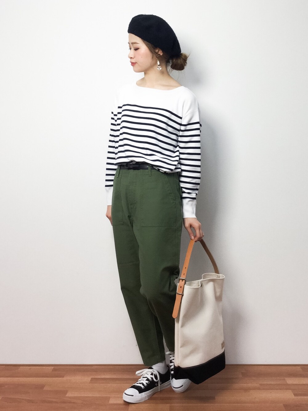 カジュアルコーデ◎ きれいなシルエットになるベイカーパンツ ジャスト丈が嬉しいです!! 今回はボーダートップスとスニーカーでとことんカジュアルスタイルにしました♪
