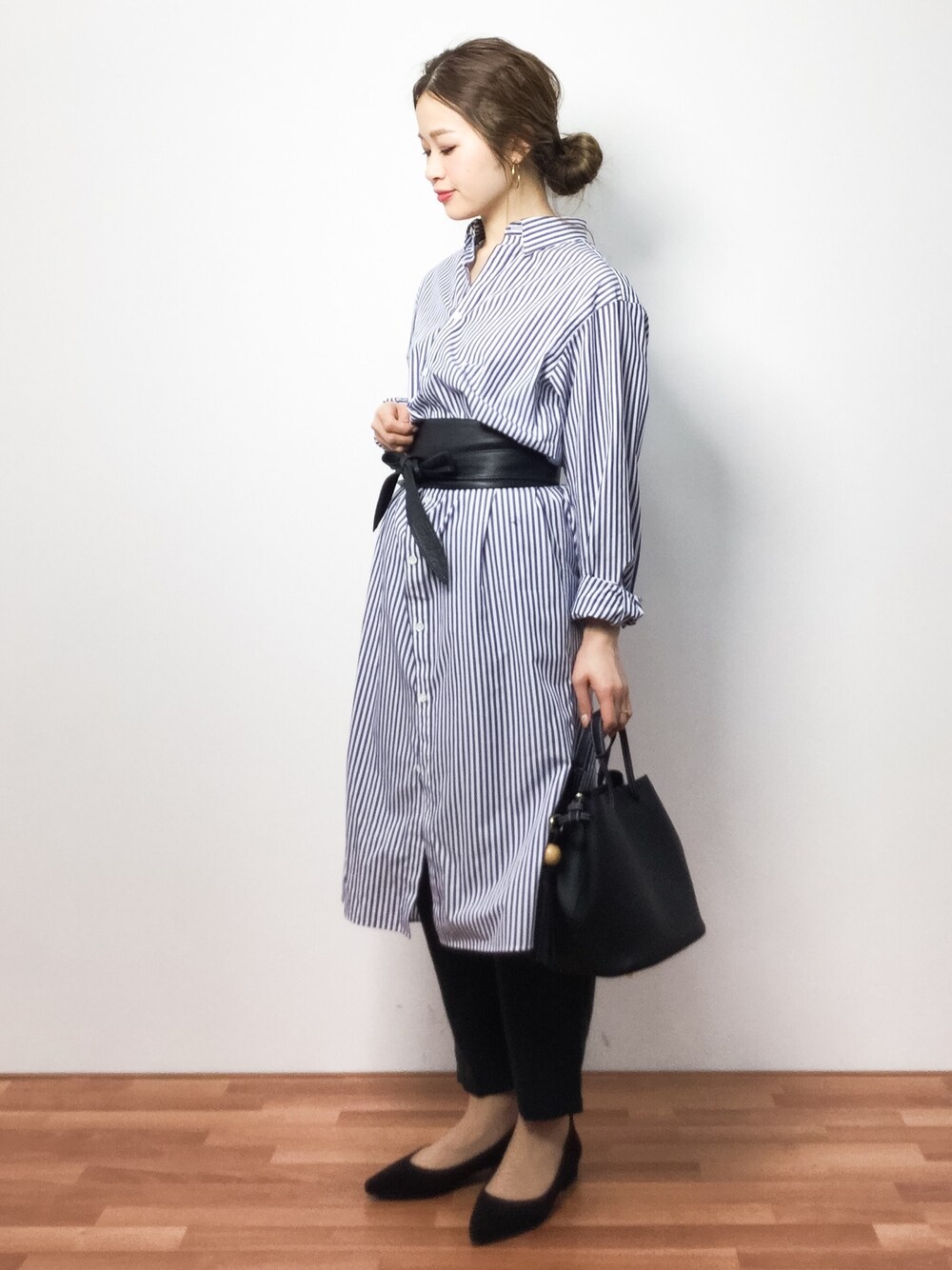 サッシュベルトを使ったロングシャツのシンプルコーデ◎