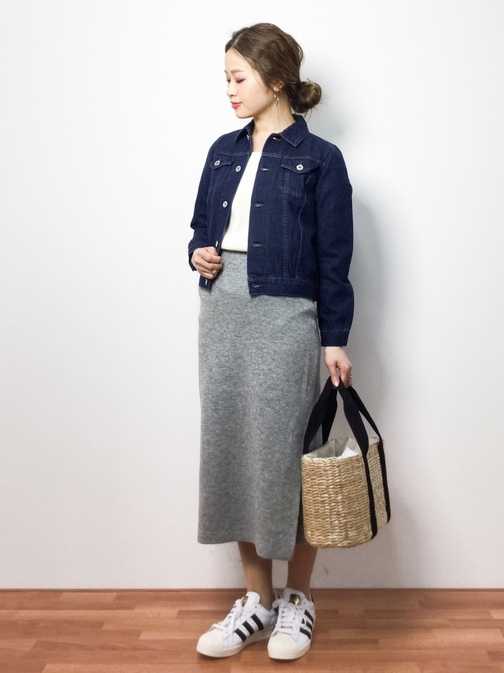 デニムジャケットとリブスカートのカジュアルコーデ◎