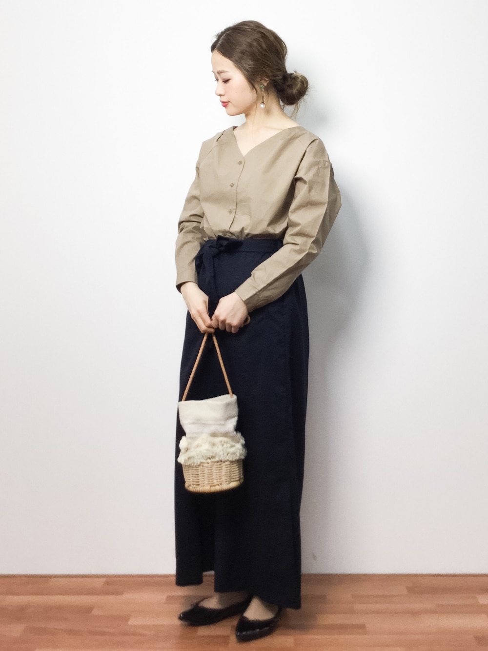 Vネックブラウスとワイドパンツのオトナカジュアルコーデ◎