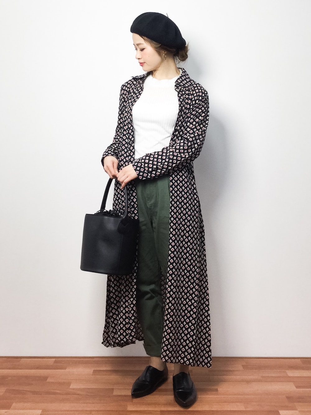 レトロ調ワンピースのレイヤードコーデ◎ ベレー帽とドレスシューズを加えてオトナカジュアルにしました♪