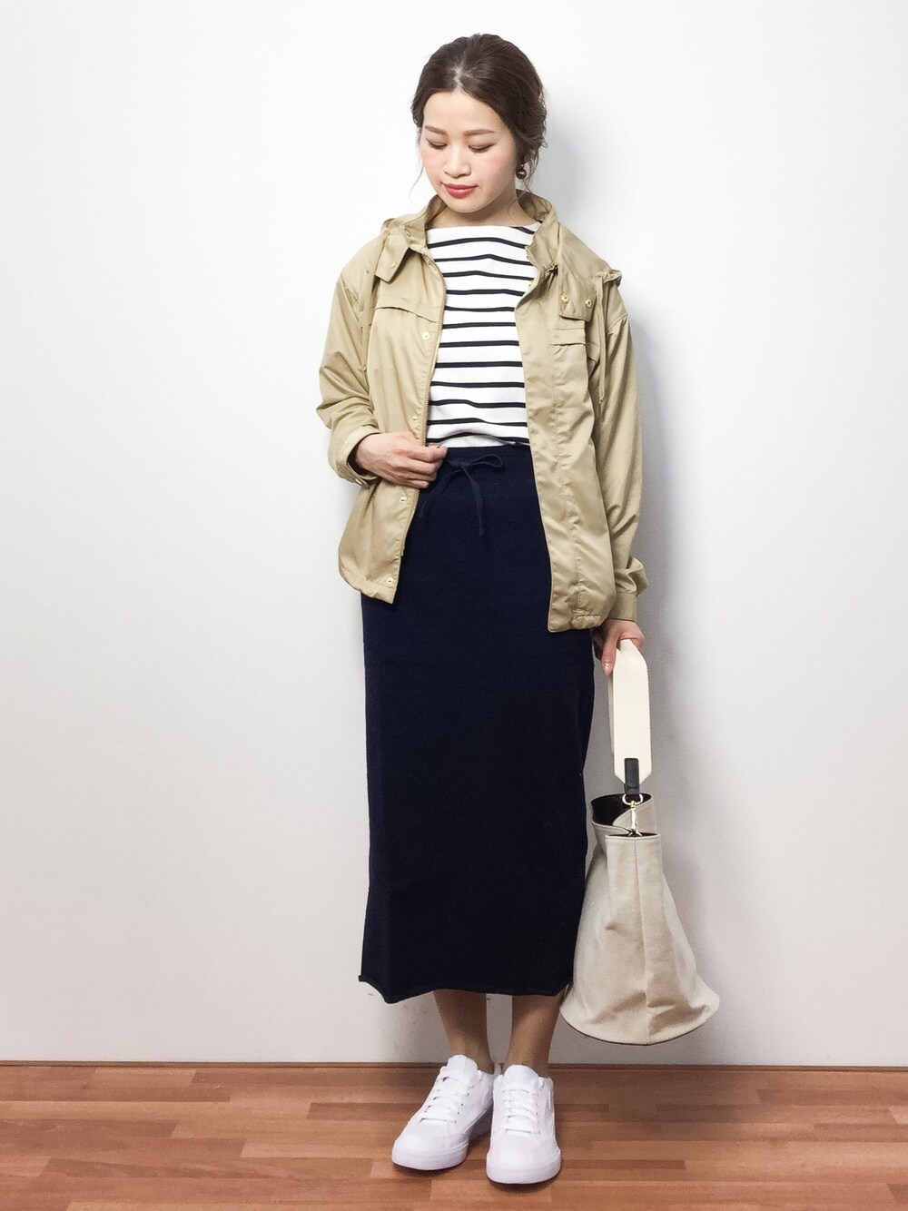 フードブルゾンのオトナカジュアルコーデ◎ ボーダートップスやスニーカーと合わせたので スカートはタイトなシルエットで、カジュアル過ぎずないようにしました♪