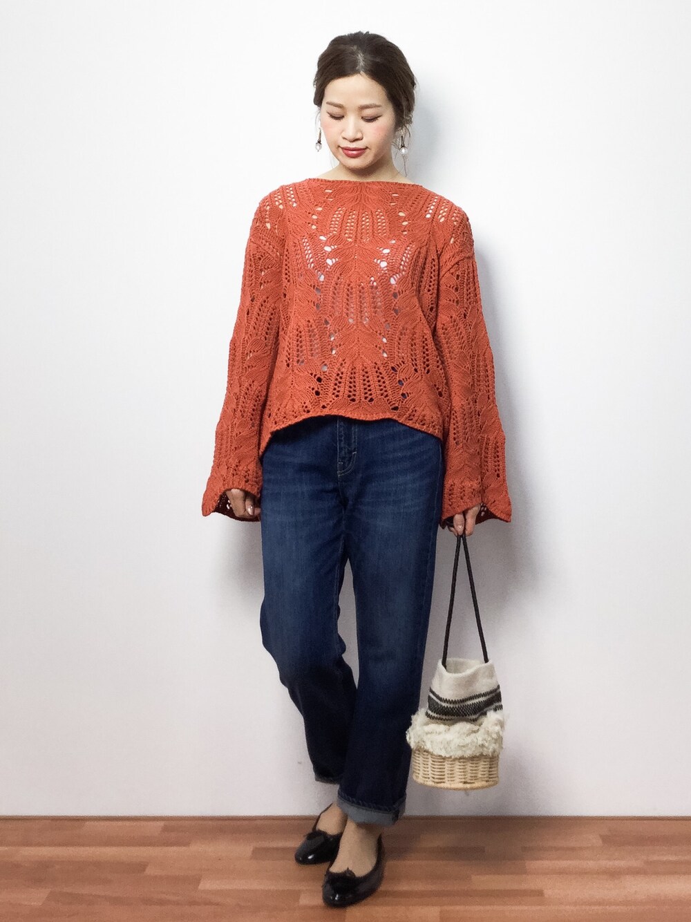 レース編みが素敵な春ニット! ざっくりと編んでるのでレースがとても際立ちます!! トップスを主役にデニムパンツとシンプルに合わせました♪