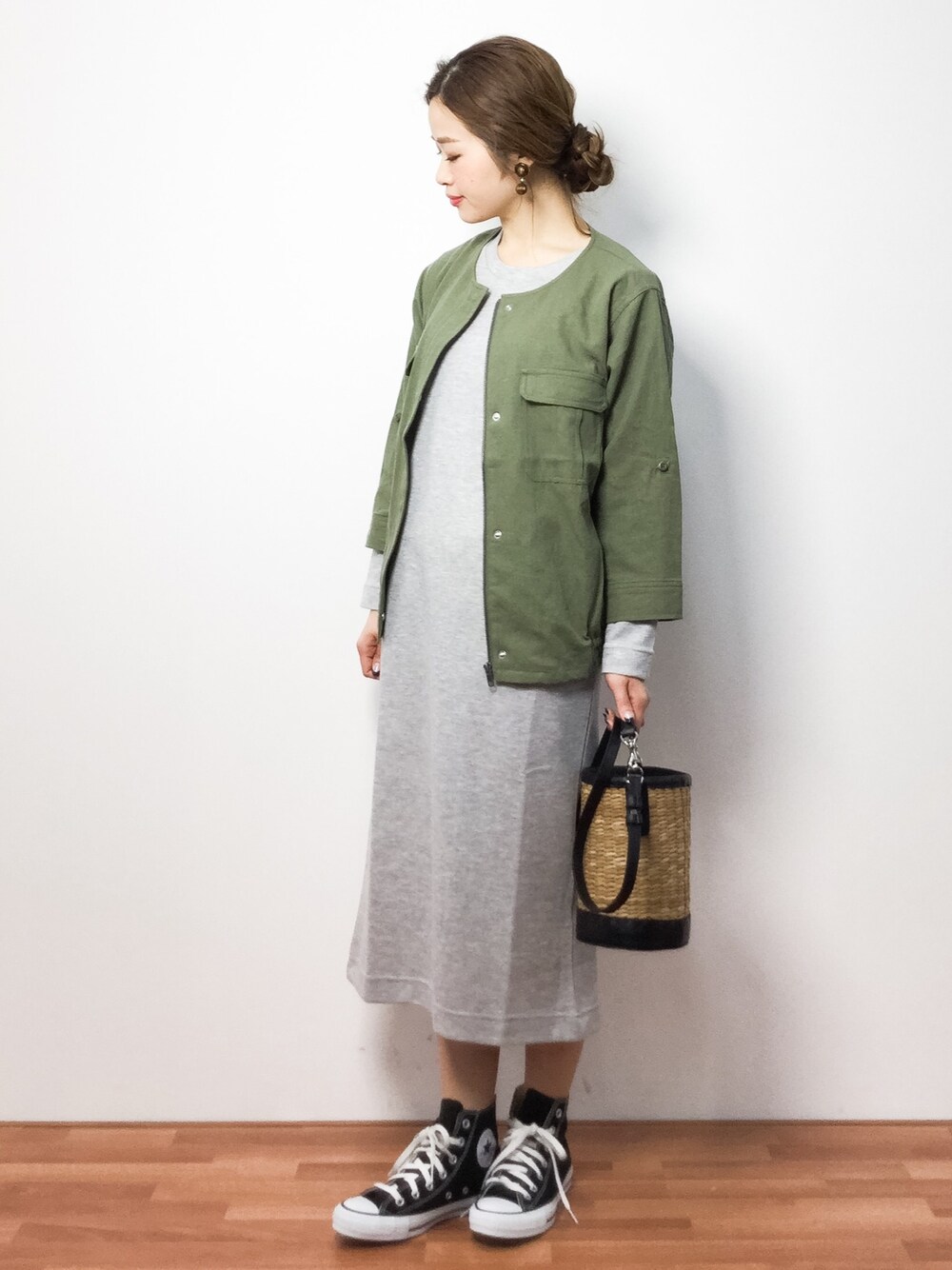 ノーカラーブルゾンとワンピースのカジュアルコーデ◎