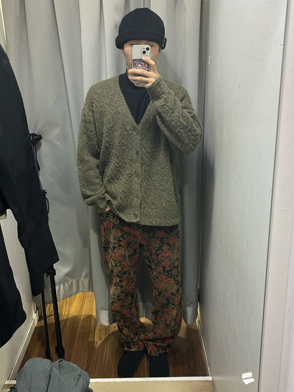 なんか今年初カーディガン出した 花柄のパンツはセカストでディグったブランド分からんけど柄が最高に良い