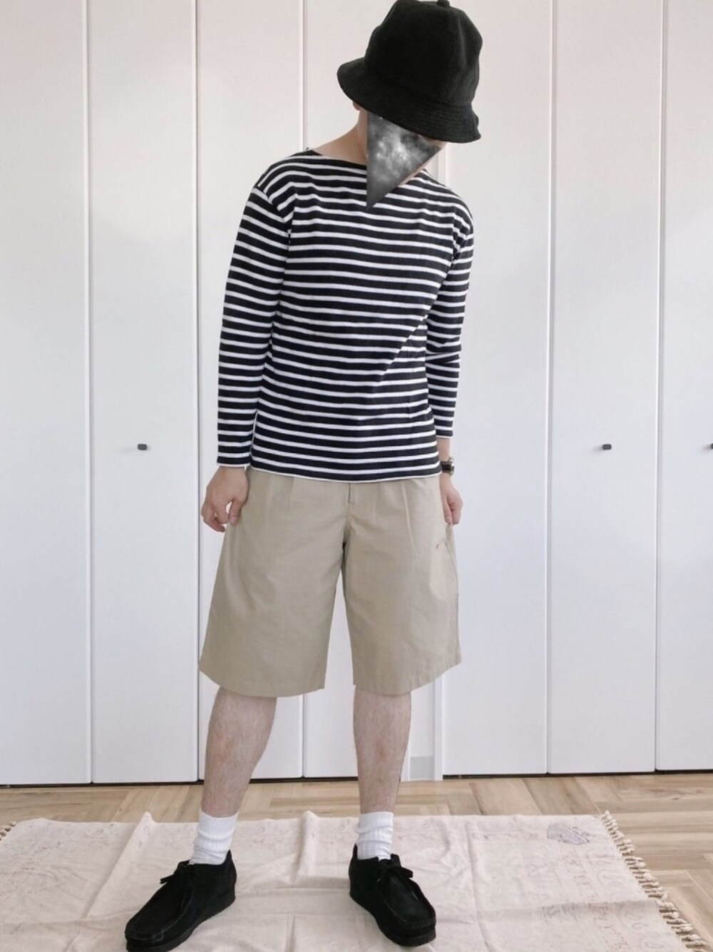 半ズボン苦手克服コーデ②🩳 ショーツはどうしても幼くなってしまうので 靴とハットはきれい目なものを選びました🦓 ショーツのときはバランス的に長袖の方が良き◎ フォロー・いいね・お気に入り、よろしくお願いします🥺