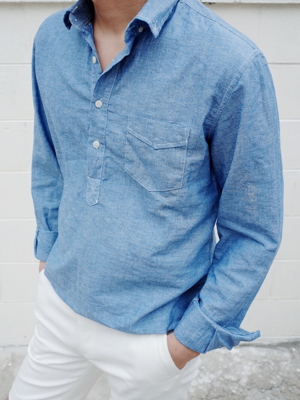 ブルー系のシャツ/ブラウスを着用したメンズの夏コーディネートの1枚目の写真