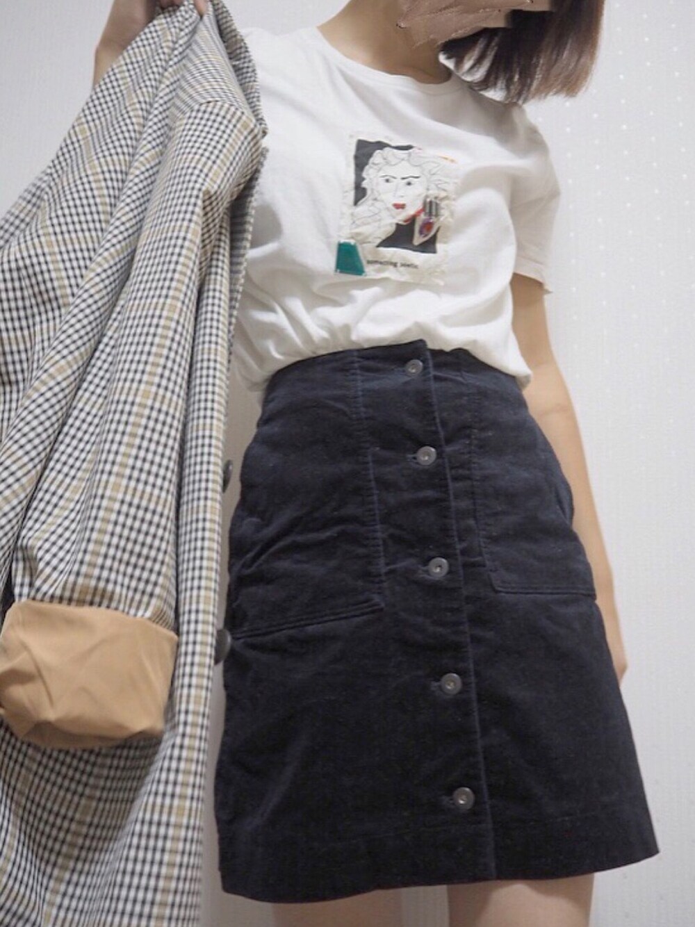みるものスカート「コーデュロイフロントボタンミニスカート(ハイウエスト)」を使ったコーディネート