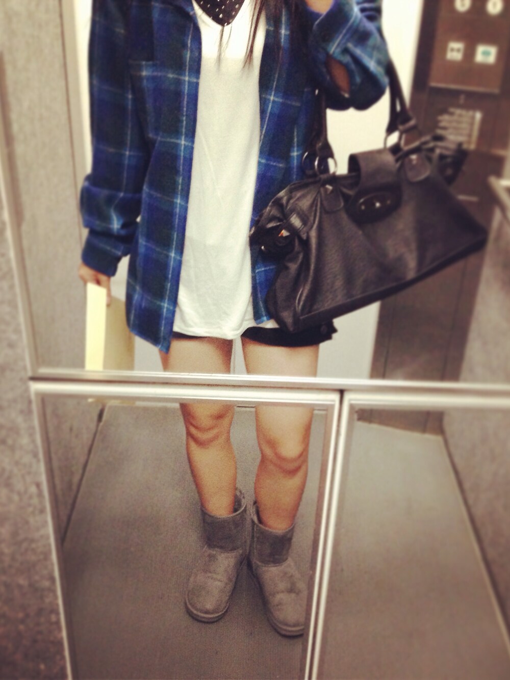 ネルシャツ…CALEE トップス…AZUL by moussy タンクトップ…AZUL by moussy ショートパンツ…? ムートン…GU 鞄…AZUL by moussy