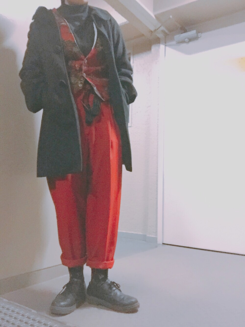 17 / 1 / 15 家を出たら 雪が積もってたよ。 少しでも 太陽 を 吸収したくて 黒色多め。 赤 は 差し色だよ。