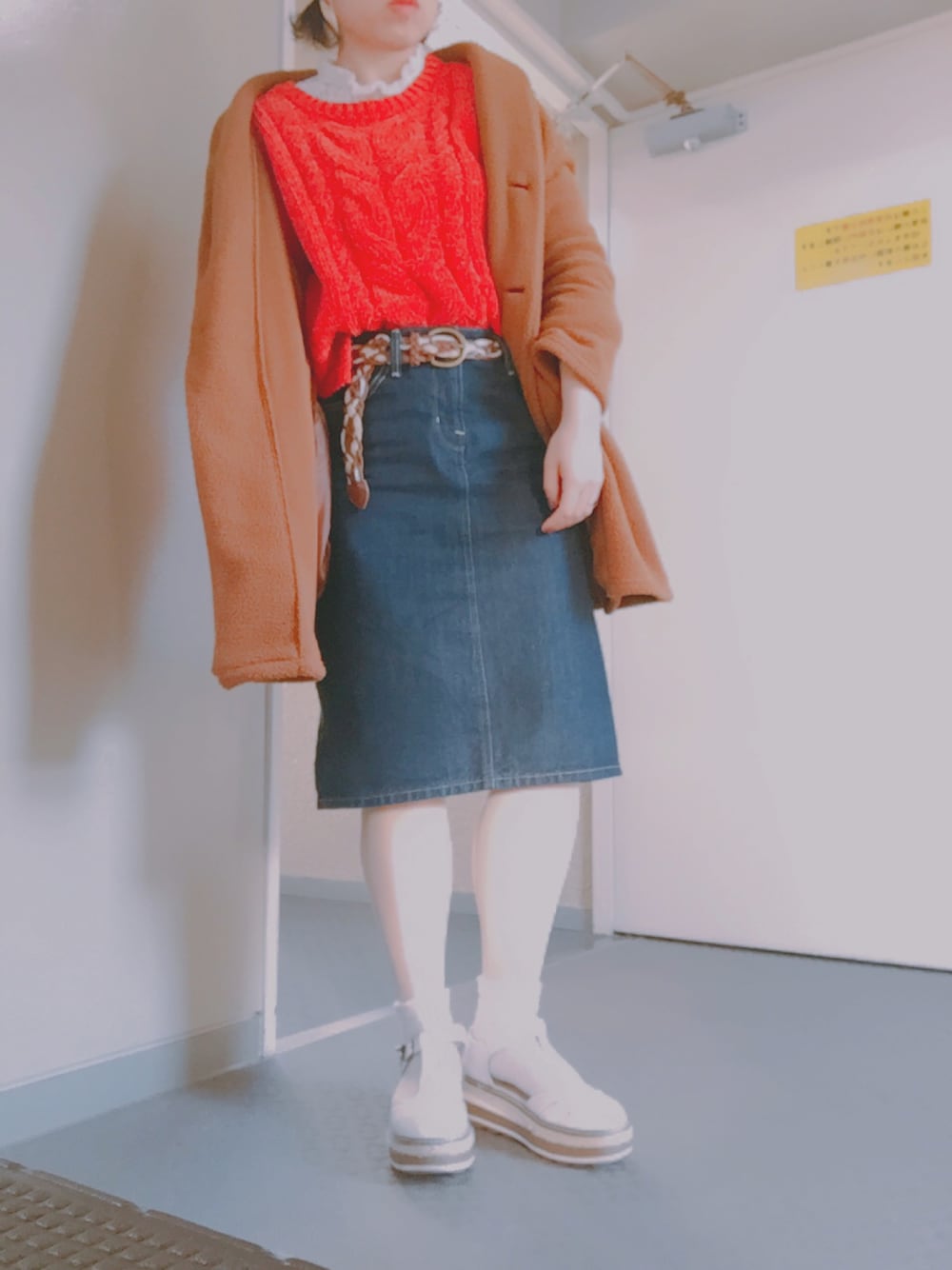 17 / 1 / 18 天気良すぎて 足元 発光してる。 実は 白色の タイツ履いてる。 earth の 赤ニット 70%off で 1000円で買えたよ。