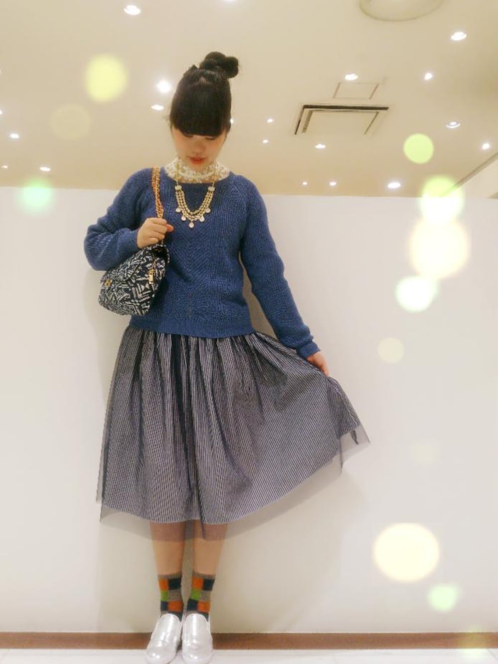 前回のコーディネートから着まわしリレー♪ 今回は前回の衿元レースのトップスを着まわし! ブルーのワントーンでまとめました☆ 衿元にアクセントでレースを見せて可愛く◎