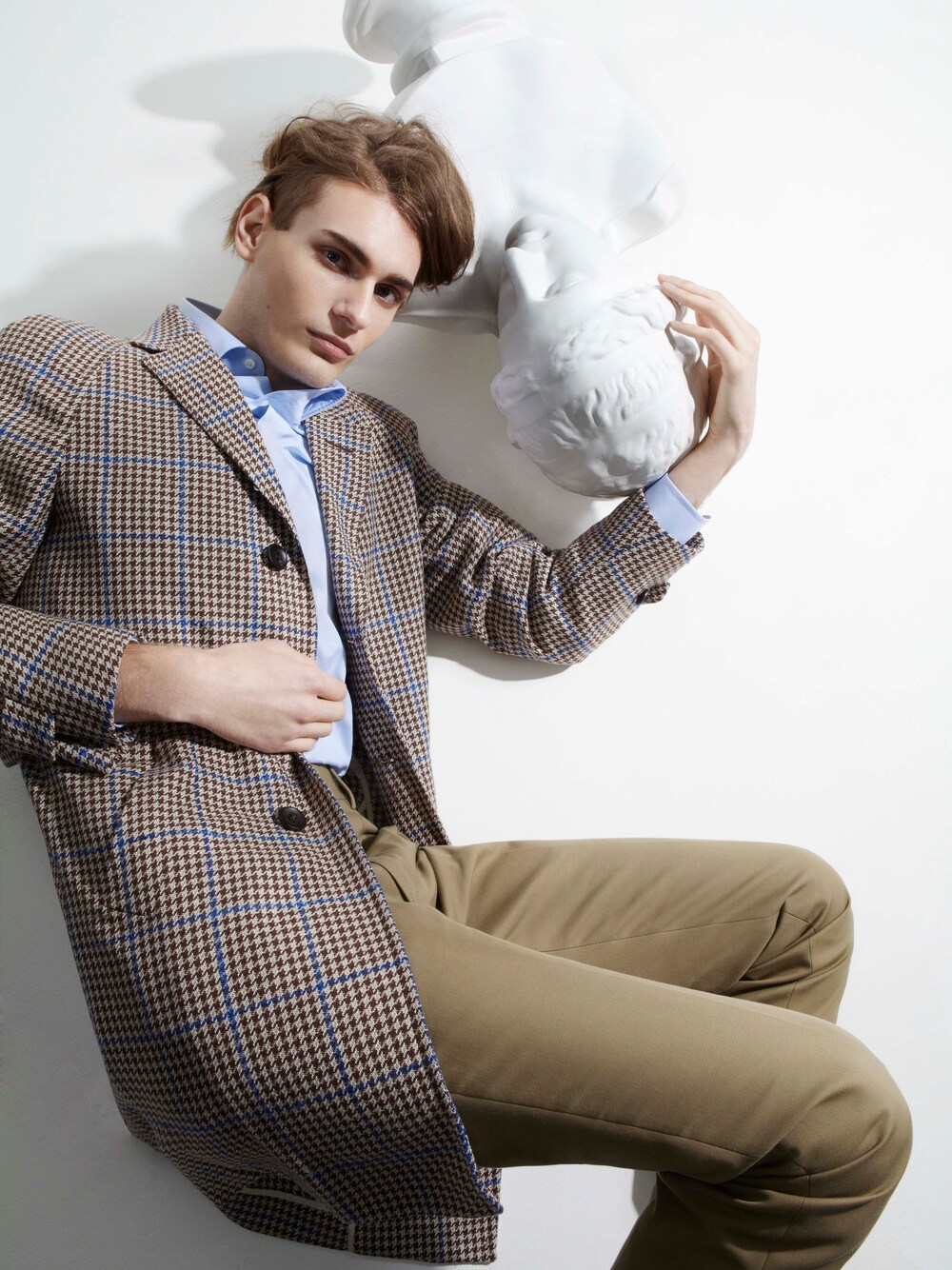 ALFRED DUNHILL千鳥格紋大衣、藍色襯衫及啡色長褲