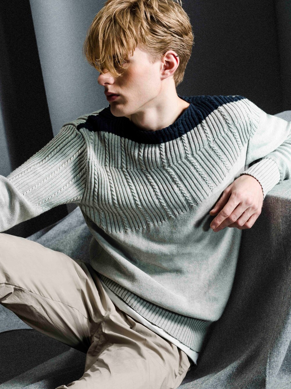 BOTTEGA VENETA 灰色綴深藍扭繩織紋毛衣及卡其色綴白色束帶長褲