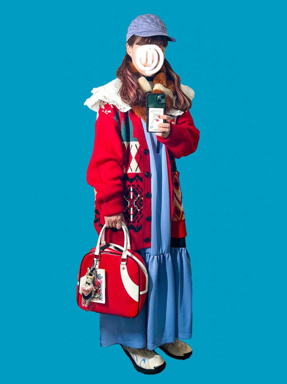 前回までの投稿にいいねとお気に入り登録して下さった方、ありがとうございます☺️✨ 全体的に赤と水色系で合わせてみました🎯 つけ襟とスヌードで可愛いさと暖かさをプラス💖