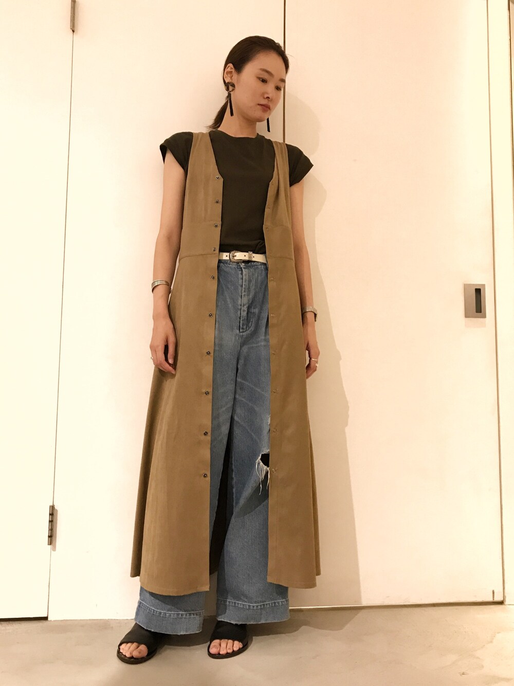 ジャンスカを羽織に。 Tシャツ+デニムに合わせるだけで、 雰囲気がぐっと増します。