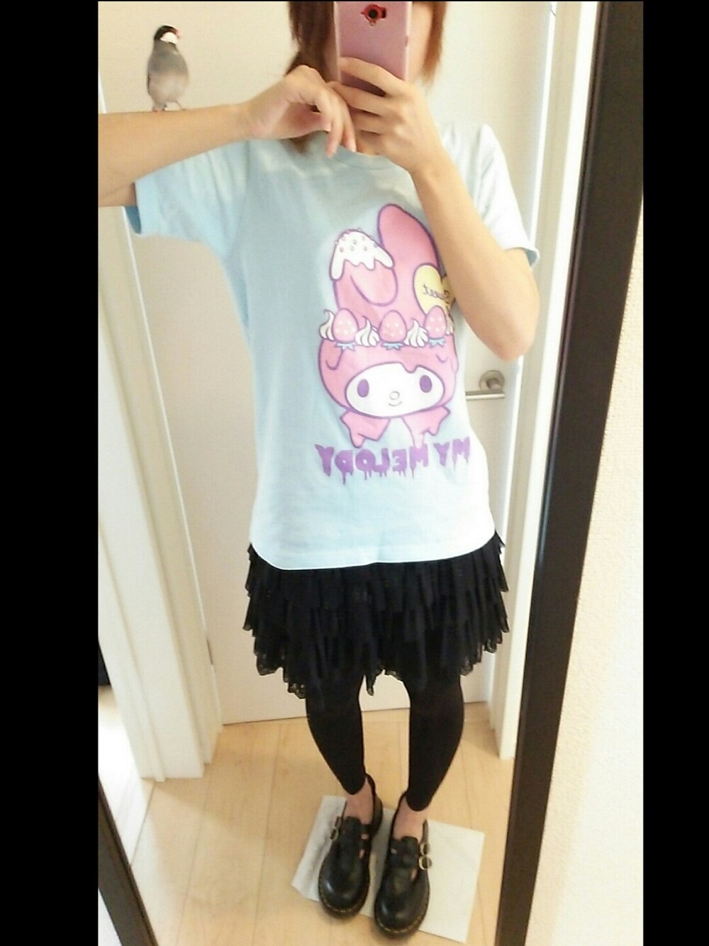 マイメロ×リッスンのTシャツ久しぶりに着てみました〜 たまにはこんなのもアリかな…笑 とりさんに邪魔されました。笑