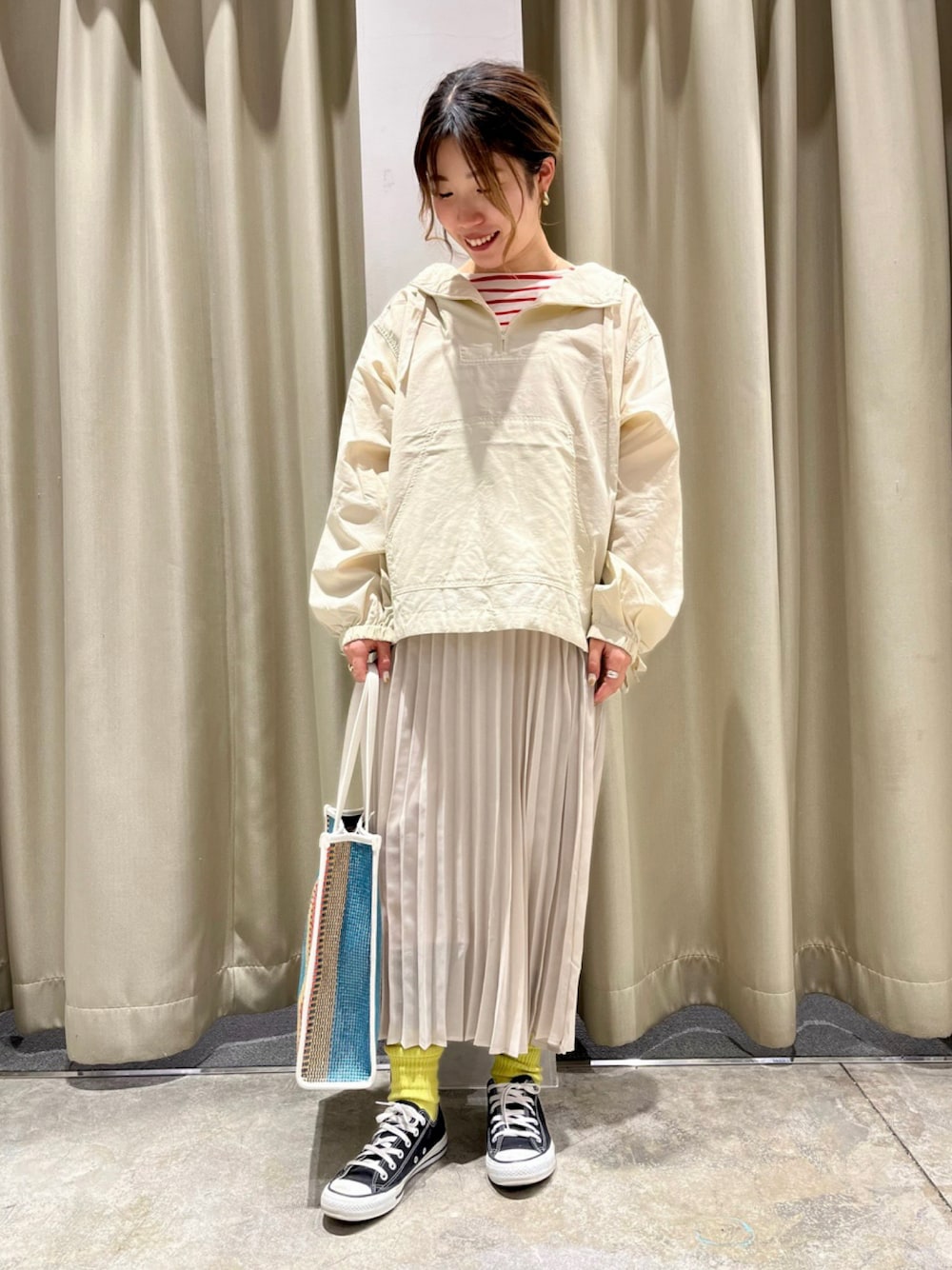 ✎𓂃トップス・アウター 着用サイズ:M・Lサイズ 普段着用サイズ:Mサイズ 【着用感】 スポーティーな印象のアノラックパーカーですが、プリーツスカートと合わせる事でカジュアルになりすぎず着ていただけます🍓 脇のボタンを外してスリット風アレンジにしても可愛いですよ𓂃𓈒𓏸 インナー次第で雰囲気も変えられるのでオススメです! ✎𓂃スカート 着用サイズ:Lサイズ 普段着用サイズ:Lサイズ 【着用感】 シアー素材が春らしいプリーツスカートです☺︎ あえてアイボリーを合わせてワントーンコーデに仕上げました🌼 インナーとバッグで色味を加えてます💐