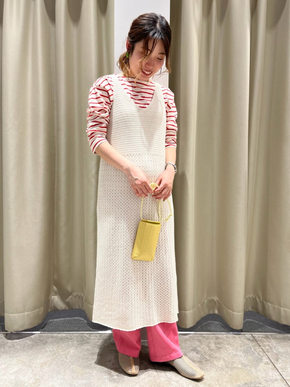 ✎𓂃トップス・ワンピース 着用サイズ:M・Fサイズ 普段着用サイズ:Mサイズ 【着用感】 透かし編みのキャミワンピースは中に合わせるトップス次第で雰囲気を変えれるので コーデの幅が広がるアイテムです! タンクトップに着たり夏までお使いいただけます🍊 ✎𓂃パンツ 着用サイズ:Lサイズ 普段着用サイズ:Lサイズ 【着用感】 トップスが赤なので色味を揃えてピンクのカラーパンツに🌷 黄色のポシェットを合わせてとことん明るいコーデにしました🌼
