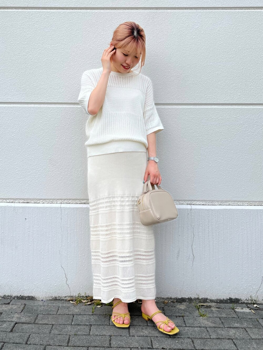 ✎𓂃トップス 着用サイズ:Lサイズ 普段着用サイズ:Lサイズ 【着用感】 網違いが可愛いニットプルオーバーです🌿 洗える素材になっているのも嬉しいポイント^^♡ ✎𓂃スカート 着用サイズ:Lサイズ 普段着用サイズ:Lサイズ 【着用感】 ワントーンコーデにしたかったのでアイボリーで統一しています◎ スカートも透かし網で揃えると地味になりすぎず着ていただけます🌈