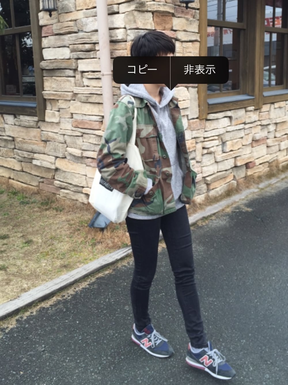 脱力コーデ。 顔隠すと男の子にみえる。 古着のミリタリージャケットかっこいい〜 トートバッグはYECCA VECCAでもらったやつです。