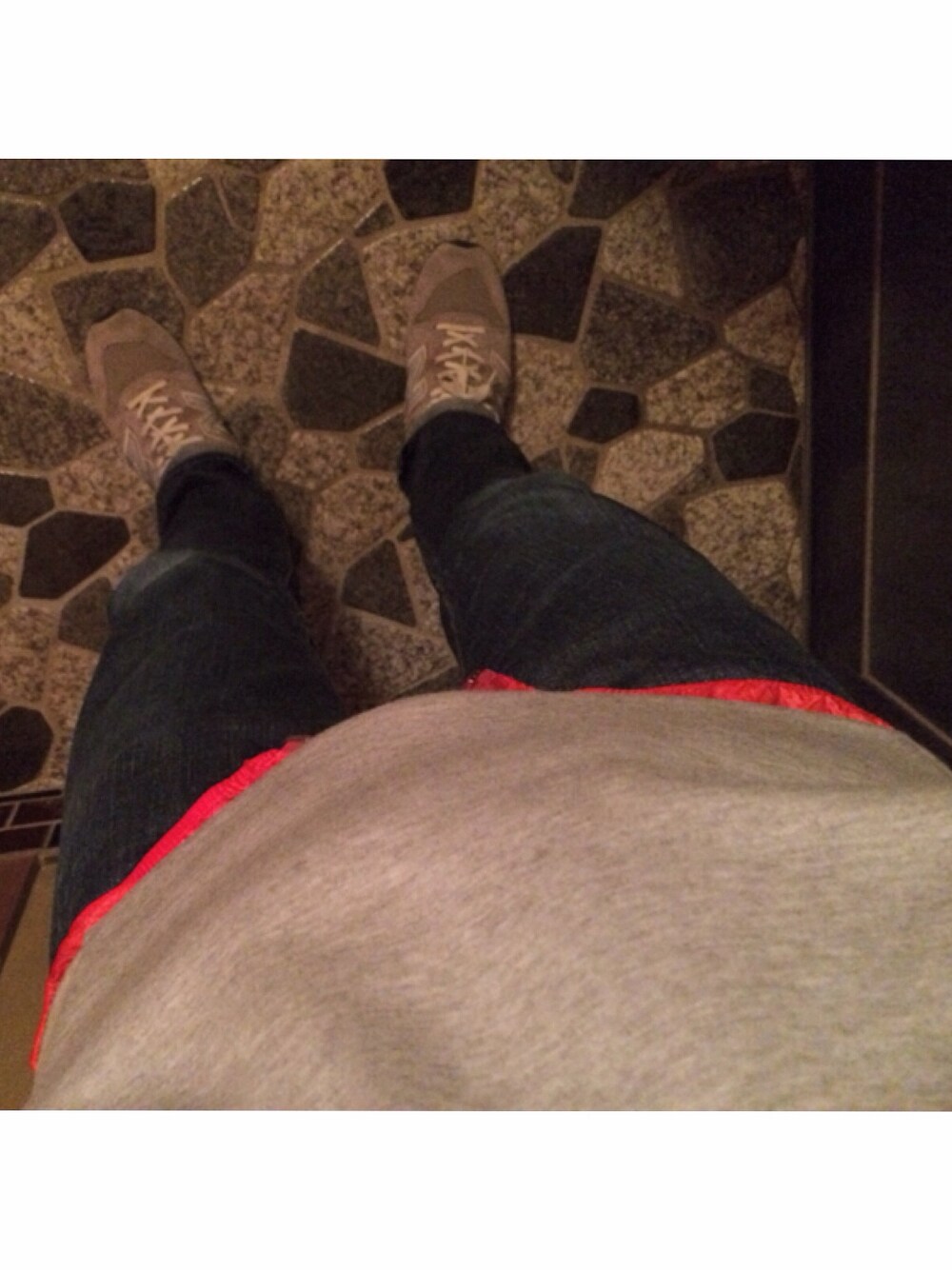 グレー系のスニーカー、グレー系のスウェットを着用したメンズの冬コーディネートの1枚目の写真