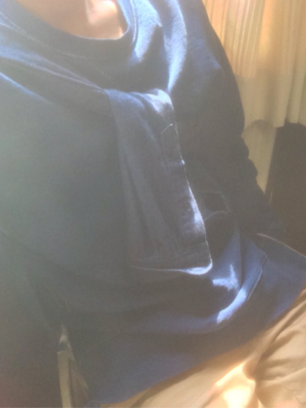 木漏れ日が気持ちいい 藍染スウェットにデニムシャツをたすき掛け 落ち着いたら誰かと買い物いきたい