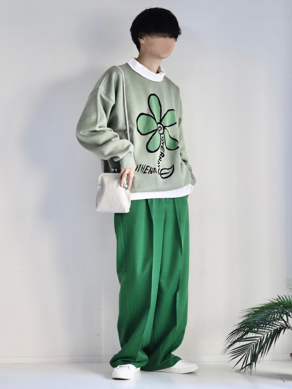 -----------【コーデ詳細】----------- ワントーンコーデ🐸🌼 この前ZOZOTOWN何となく見ててビビッときて買った、花のでっかい絵がついたニットです🙆♂️ 何やこれ的な感じで、着て行ったら絶対友達につっこまれるだろうなぁと思いながらポチりました😂 最近じぶんが物を買う基準として「なんか変なの」とか「変わった色」「変わった柄」を求めてる気がします🙄笑 パンツはトップスに合わせて、パキパキグリーンのパンツにしました👍🟢 センタープレスが入っているので綺麗め見えするカジュアルなカラースラックスです🙆♂️履き心地がサラッとしてていい感じです! そしてバッグも「変わったやつ」っていう基準で買ったがま口の小型ショルダーバッグです✨ 友「今日めっちゃ緑やん、カエルみたい」 自分「バッグもがま口ガマガエルやでぇ」 っていうやりとりの為だけに買いました…が、そもそもツッコミなしに終わったらどうしようかと今、急に不安になってきました🙄🐸笑 -----------【その他SNS】----------- プロフィールにリンクが貼ってありますので、覗きに来てください‼️🙇♂️ またお仕事などのご依頼があれば、Instagram/TwitterのDM宛にお願い致します✨ 📕Instagram : mr___szk 📘Twitter : UC___MR (間にはアンダーバーが3つ_ _ _ )
