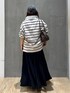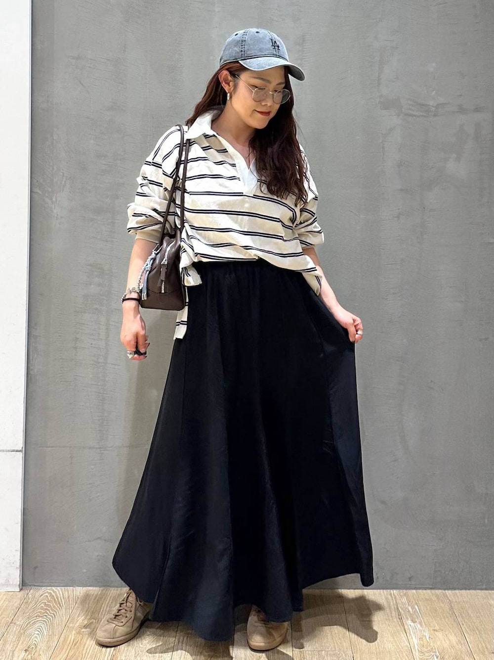 大人カジュアルコーデ◎ 155cm/M〜L体型/骨格ナチュラル/ブルベ冬 ボーダーポロを主役にした、リラックス大人カジュアル◎ ゆったりトップスをタックイン気味にして、腰位置を自然に引き上げています^ ^ 落ち感のあるブラックのロングスカートで、縦ラインをきれいに強調◎ カジュアルなキャップで、気負わないムード◎ 小さめのバックで上品さと女性らしいバランス感をキープ◎ 足元は淡色スニーカーで軽さを足し、重く見せない工夫も^ ^ ラフだけど大人っぽい、頑張らないのにサマ見えコーデです◎