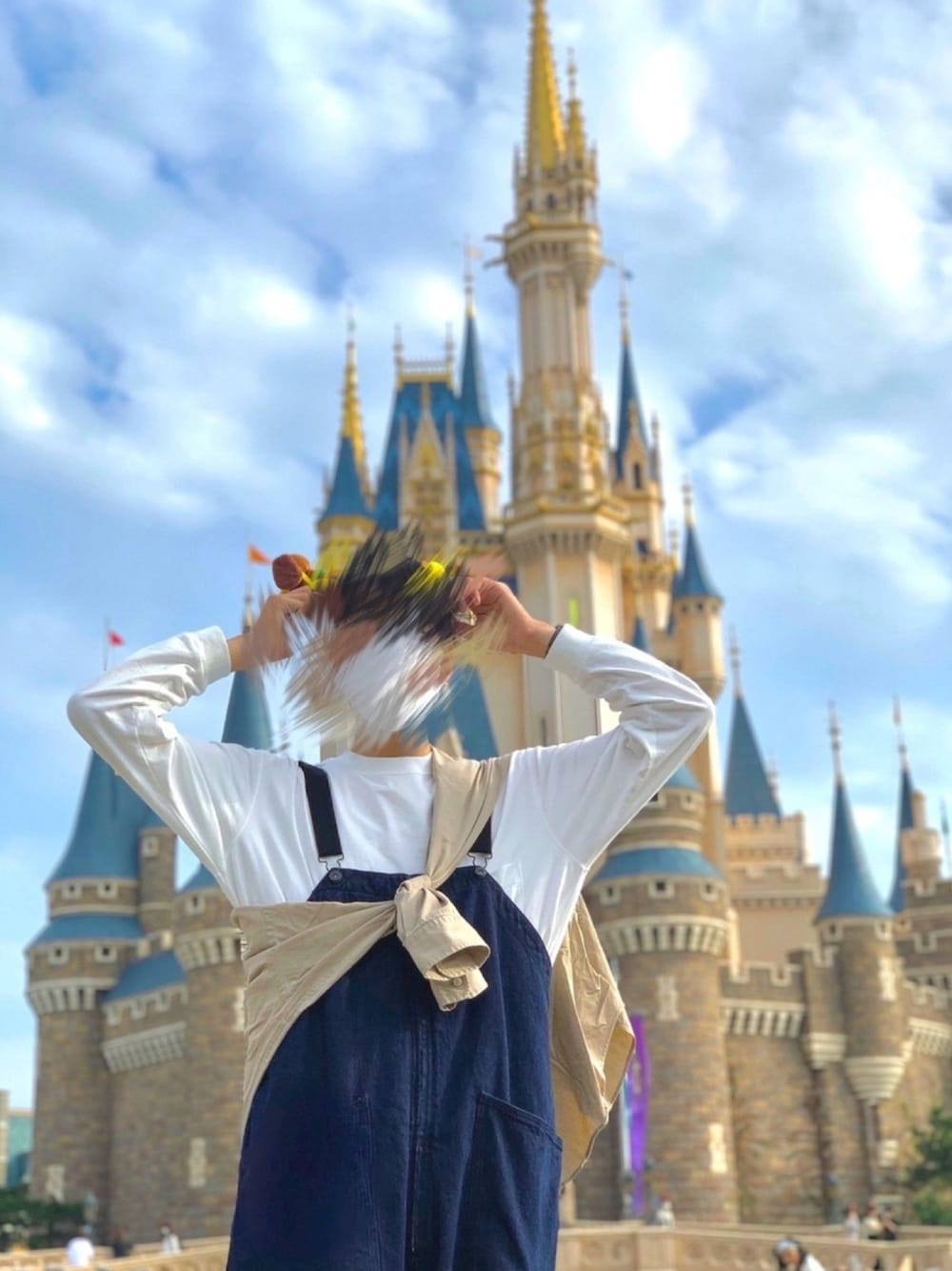 ' 青空のTDL🏰 全身の写真なかったけどこれが一番だった はじめてのオーバーオールのデザインがすこすぎる ただレンコン掘りに行くんですか?って感じの形してて草みんなに言い訳しまくった & たすき掛けで洒落てんなア自分という印象 下はハイカット履いてるよ
