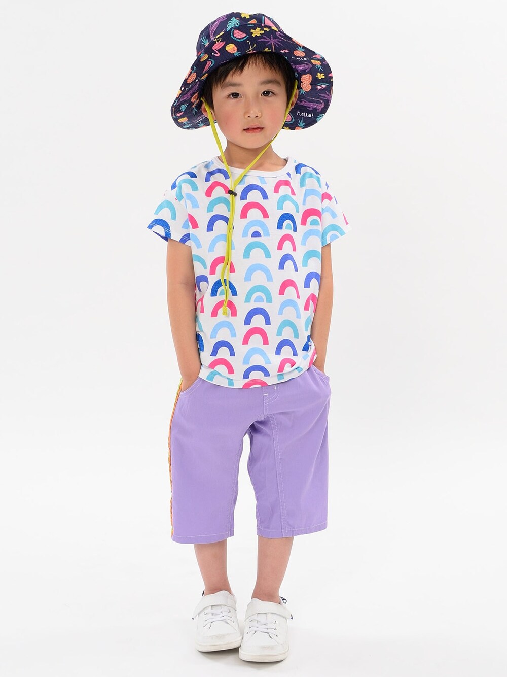 虹のようなカラフルなアーチの総柄切替が可愛いTシャツです♩ 同じ柄の女の子のワンピースがあるので男女でおそろいでも着ていただけます☆