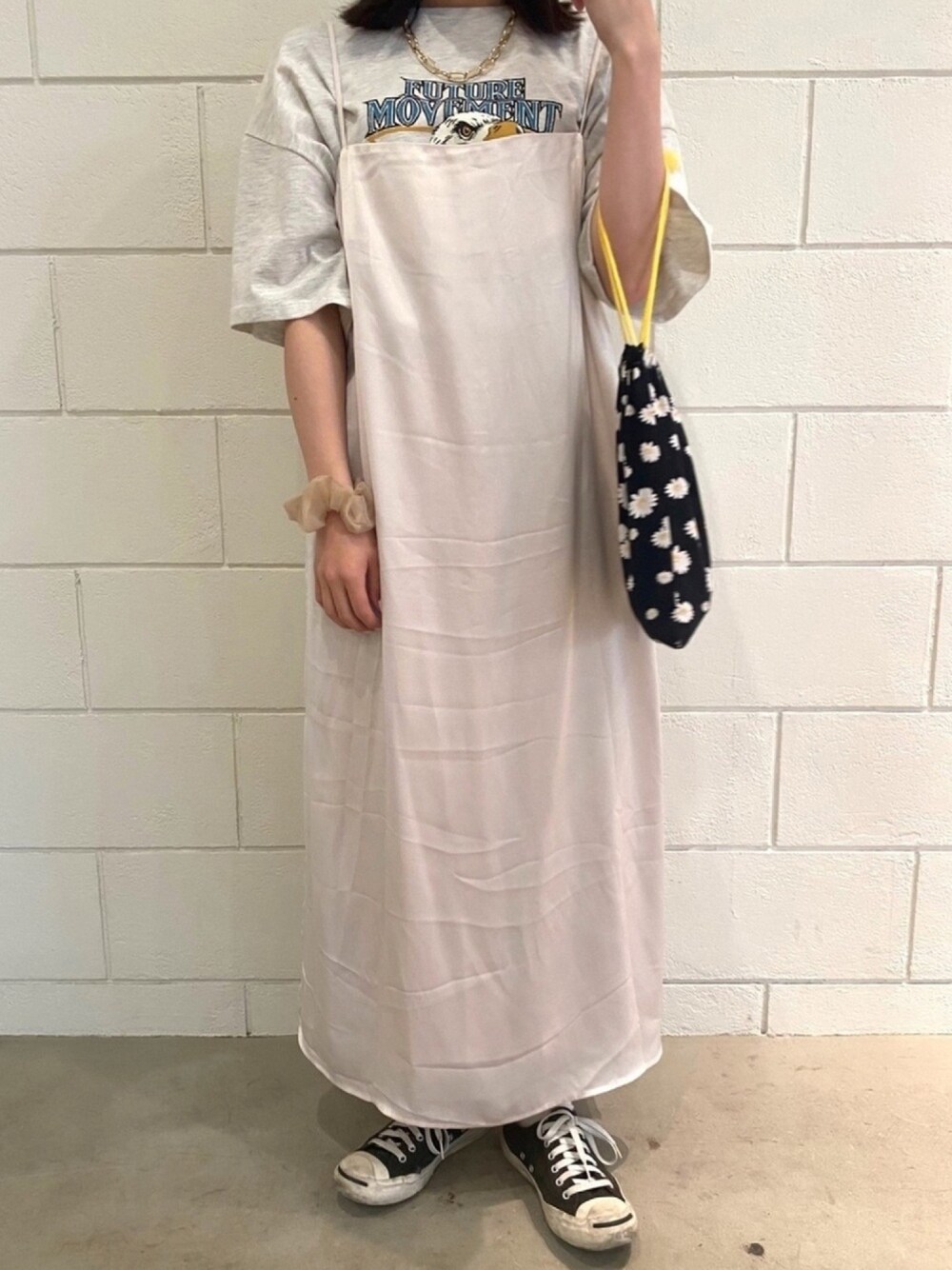 ☻いつもご覧いただきありがとうございます☻ メンズっぽいTシャツを キャミワンピで女っぽく着るのが好き👩❤️👩 このTシャツ古着っぽくてかわいい〜! バッグや靴はカジュアルに♡