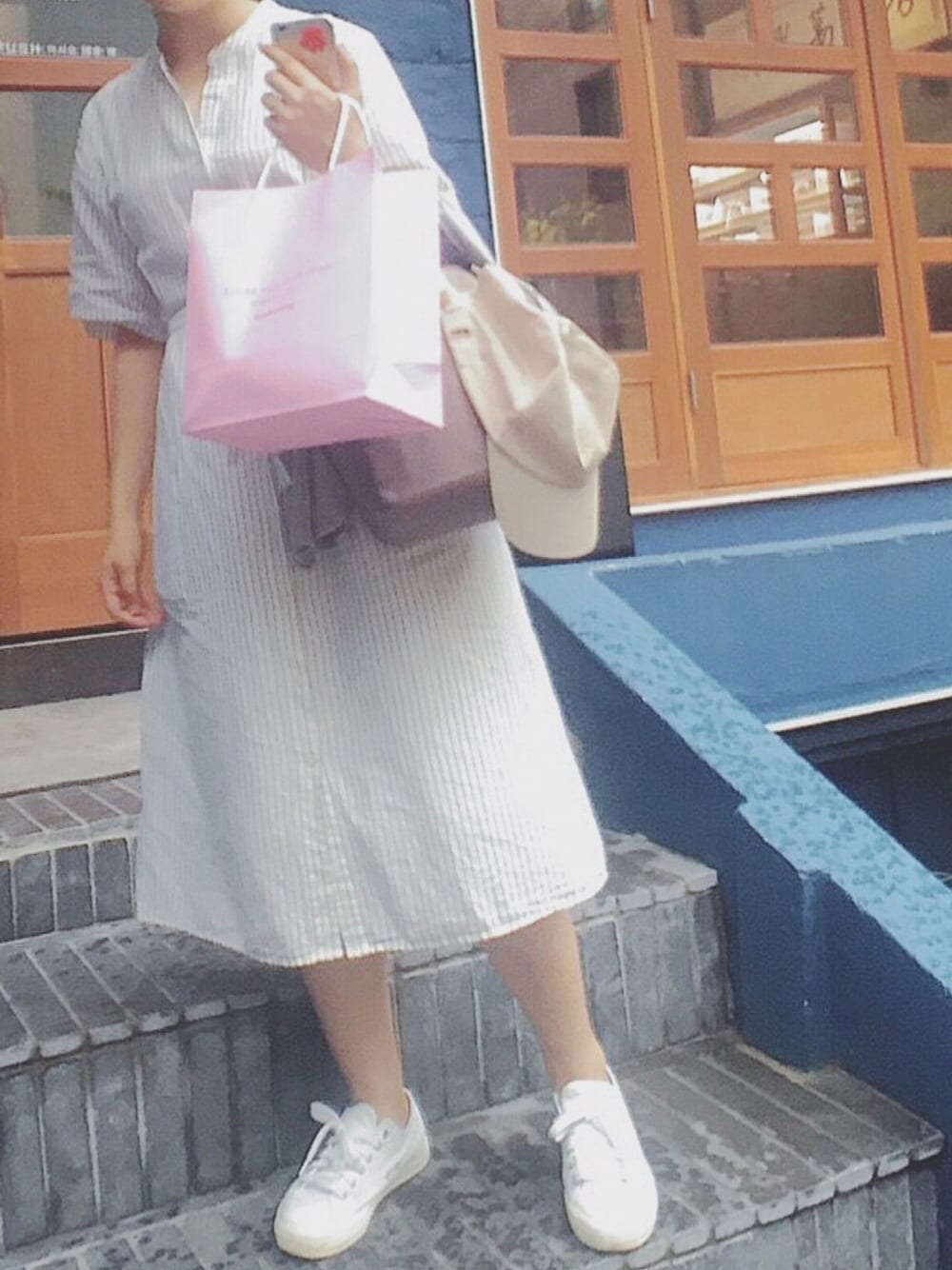 旅行スタイル。(@韓国) この日はカロスキルへ。おしゃれエリア。 落ち着いた雰囲気に合わせて カジュアルながらもワンピース🙌