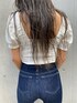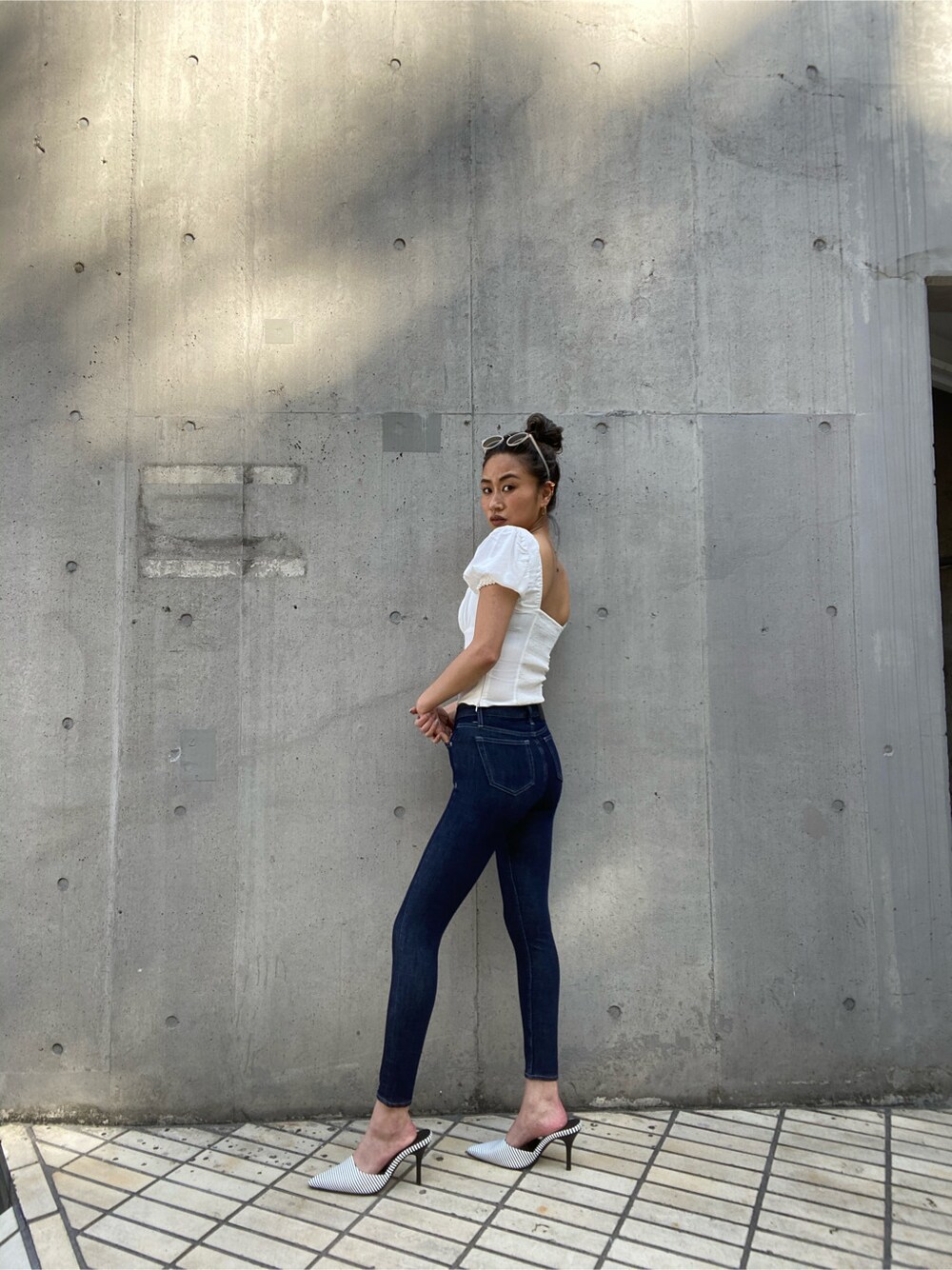 stunningstretchdenimの着回しスタイリング。 INDデニムに相性のいいトレンドのパフスリーブtops×ボーダーミュールを合わせたすっきりとしたシンプルコーデです