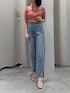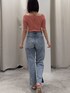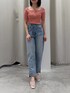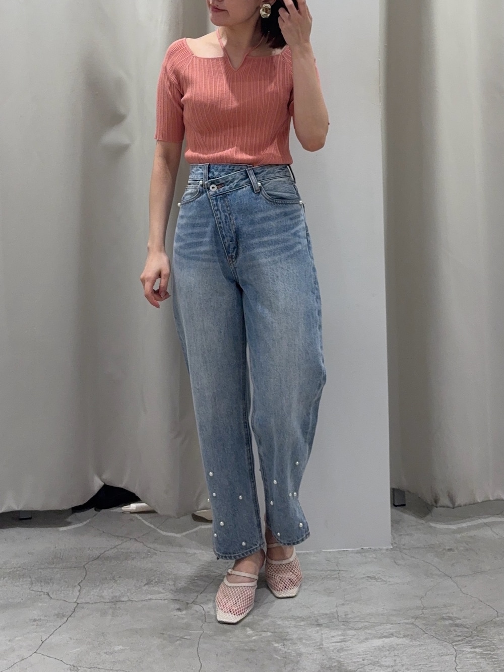 【tops】 シンプルで着回し力が抜群なハーフスリーブニットです。首の紐がアクセントになり、定番感はありつつもジャケットなどを羽織っても可愛いし、ランダムリブでシンプルすぎないから一枚で着てても可愛いです。 【denim】 158cm骨格ウェーブがSサイズで着用。 足首にスリットが入ってるので、歩いた時にちらっと見える足首が華奢見えして可愛いです。 よくあるパール付きデニムと異なり、後ろにもパールがあるので後ろ姿も可愛く見えるところがポイント高いです。