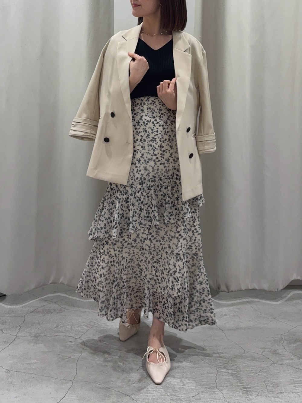 【jacket】 肩に羽織るだけでサマになるバイカラーボタンジャケットは、今の時期一枚は絶対持ってた方がいいおすすめの羽織りです!! 長袖じゃないので肩に乗せたときも重たい印象に見えないし、手首が見えることで女性らしい印象 + 着痩せ効果があります! ジャケットが苦手とおっしゃる方の多くは、長袖のジャケットで"着られてる感"が出てしまう方なので、この七分袖ならお仕事感もなく程よいきちっと感でオンオフ兼用が可能ですよ🥰 肩パッドや極度なくびれシルエットにもなってないのでコンサバ見えもしないです◎
