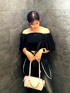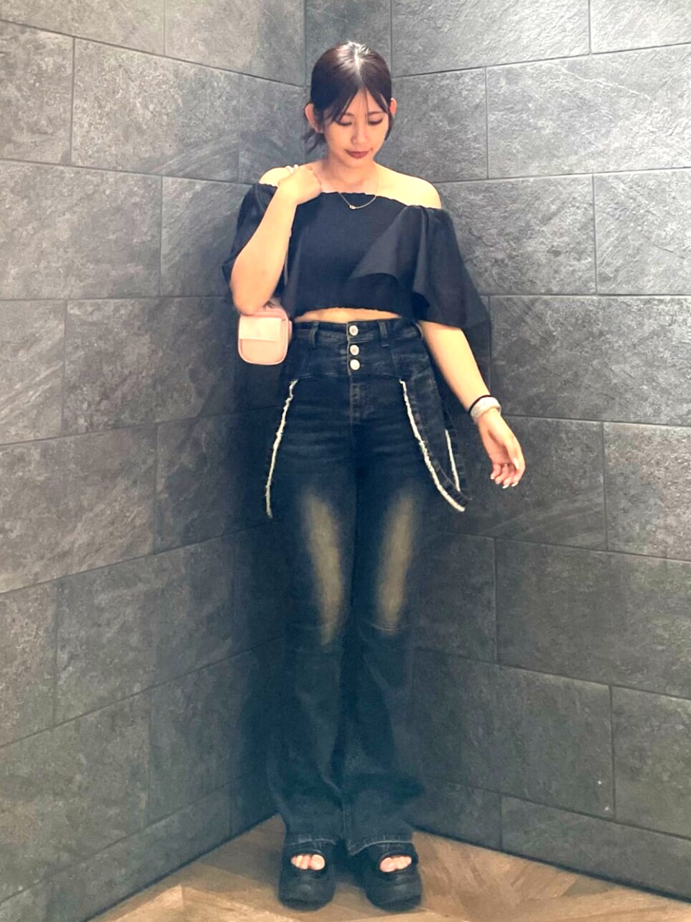 【トップス】オフショルでも肩出さずでも◎ 前後シャーリングなので着やすさ100点♡ 【デニム】とにかく柔らかい!!産後+骨格ウェーブでもXS余裕でした⤴ 【バック】柔らかめの素材感で携帯、定期、お財布、エアポッツいれてもかなりゆとりがある容量です🛍 【サンダル】23-23.5cmでMサイズで◎軽くて傾斜もなく、1日8時間履いてる日でも私は疲れませんでした♡