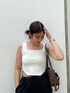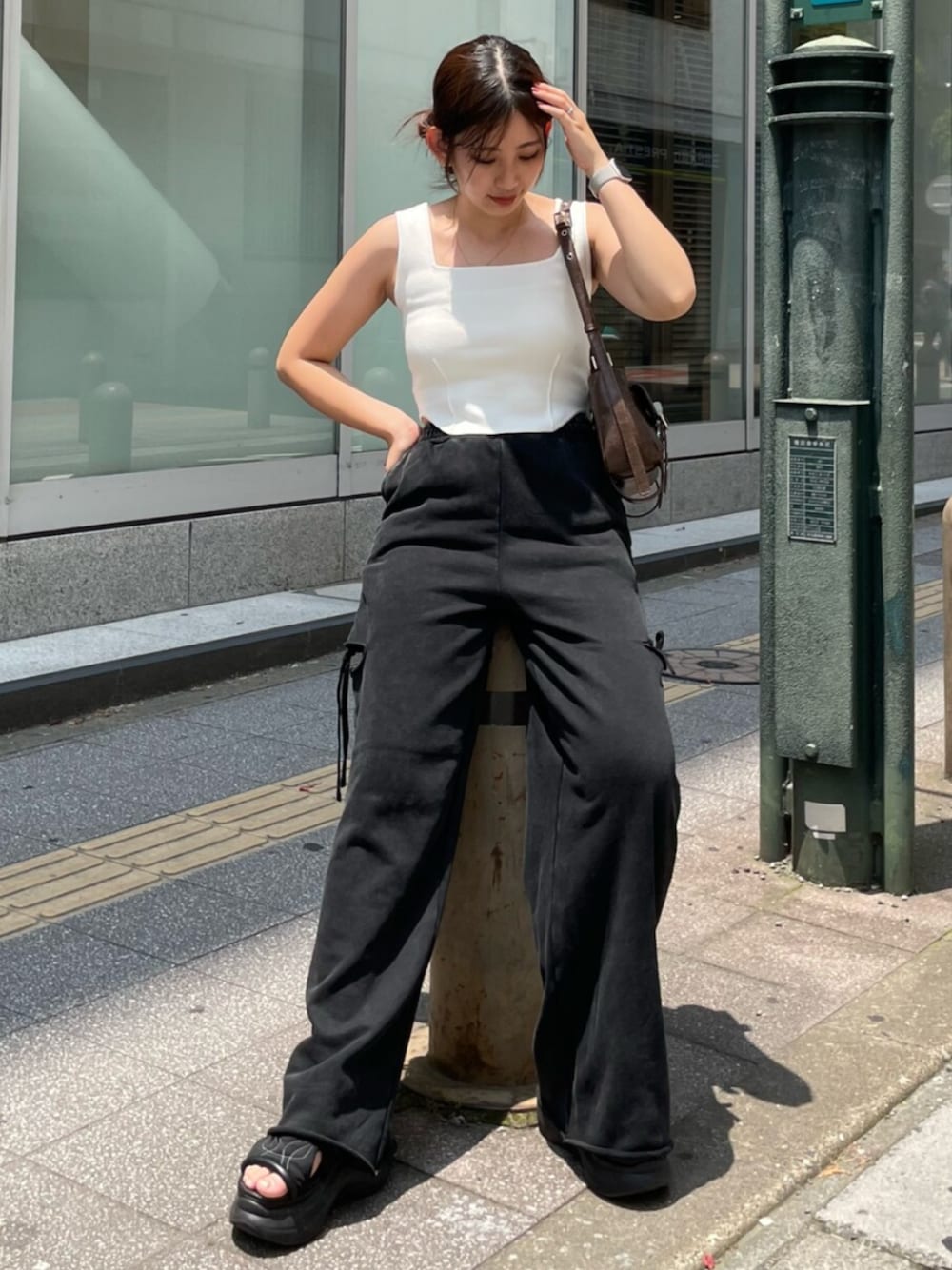 【タンクトップ】サイドの部分のみ少し短めでウエストの細見え度💯程よいタイト感で着脱しやすいですよ♡ 【パンツ】腰回りのラインをひろわないので特に骨格ウェーブ大優勝なパンツ!!🖤 サイドあいてるので抜け感も出るし、涼しさ◎ 【バック】500mlのペットボトルが入る容量で、ポケットも多いので使いやすさ💯 【サンダル]23-23.5cmでMサイズ着用しています!