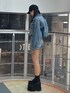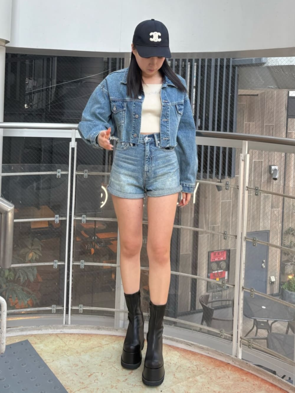 ジャケット→バラバラできてもかわいいデニムジャケット🩵🩵ショート丈でスタイルアップです!! デニム→へそ上3センチのスーパーハイウエストなので、足長効果抜群です!! シューズ→23.5センチでMサイズ履いてます!