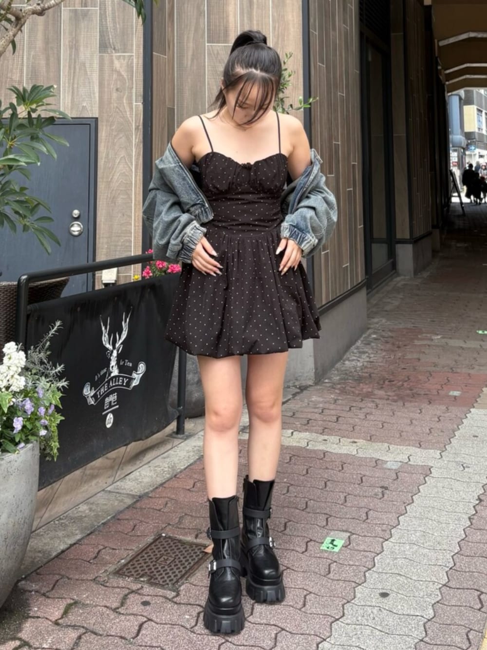 デニムジャケット→生地しっかりしてるので、あたたかいです!!気温の調節にぴったりです。 ワンピース→今流行りのバルーンスカートになってて、スタイル盛れます!! シューズ→23.5センチでMサイズ履いています