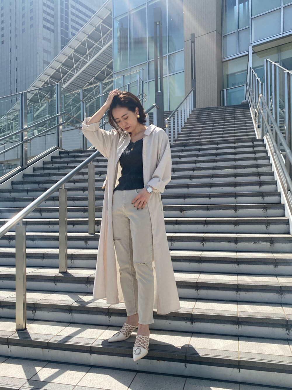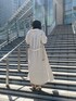 春にピッタリのリネンライクなマキシシャツはなんと2wayで着回ししていただけます!共地のベルトがついているので、前を閉めてワンピースとしても着れるのですが、今回は羽織シャツとして着てみました。着丈は長めですが、サイドのスリットとバックスタイルにもタックが入っている為、動きが出るので重たく見えないですよ♡インナーに着ているトップスは前から見るとシンプルですが、大きく空いた背中にナローストラップがプラスされているので華奢見えするアイテムです。洗い加工を施した絶妙な色味が特徴なので、いつものコーディネートにプラスするだけでもグッとオシャレ度を高めてくれます。全体的に春らしいコーディネートにしたかったので、ボトムとシューズもアイボリーで合わせています。
