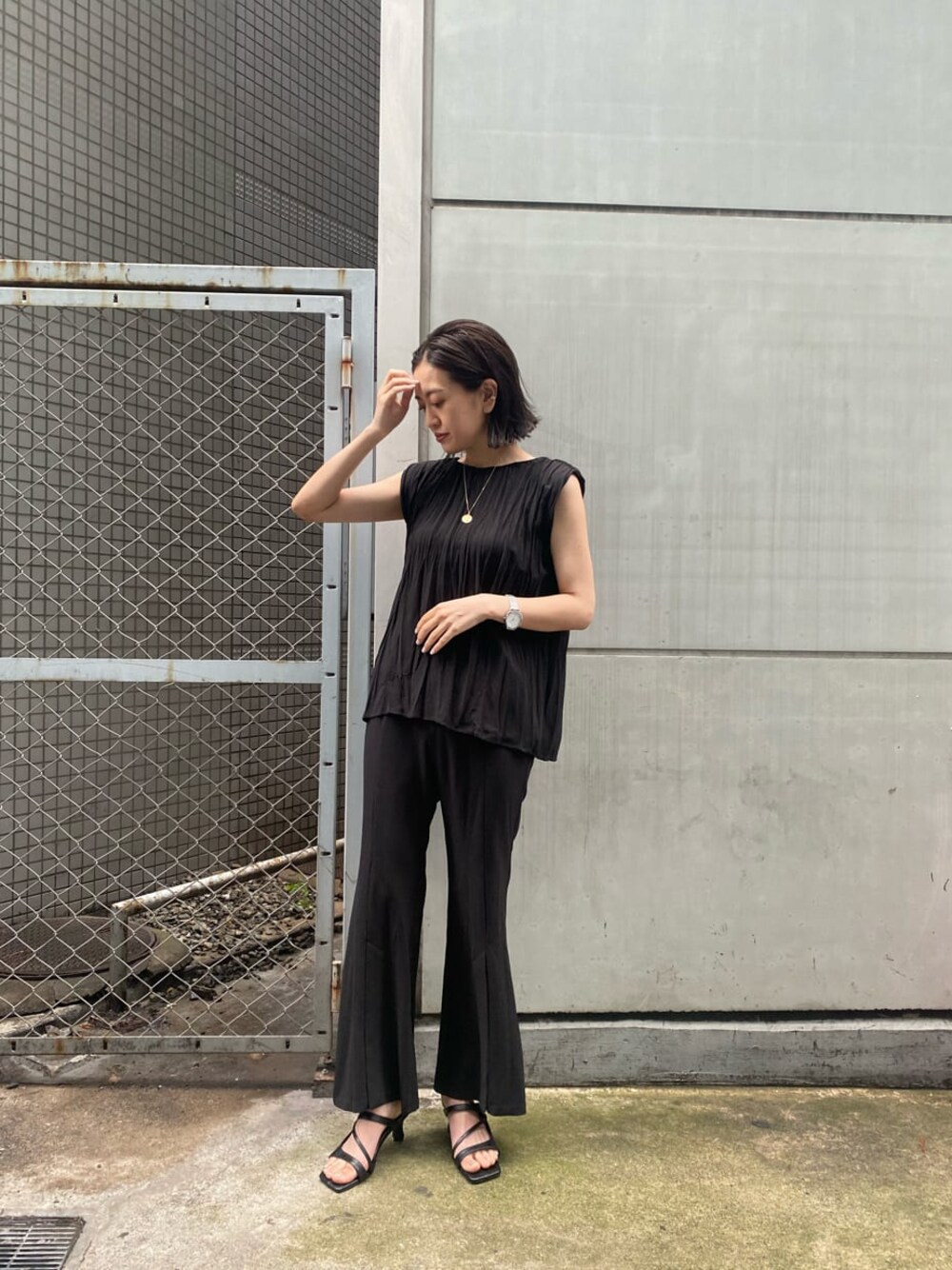 オススメセールアイテムのご紹介です♡夏にセットアップで着たいオールブラックのコーディネート。トップスはお尻が隠れるくらい長さがあるので、細身のパンツと合わせてもしっかりスタイルカバーしてくれます◎プリーツ加工のような素材なので、無地でも動きがでるのが嬉しいポイント♪シンプルですが、素材でおしゃれを楽しんでいただけるトップスです。同素材のパンツはセンターにスリットが入っているのでスタイルアップ効果もあります◎カジュアルにスニーカーやぺたんこサンダル合わせもオススメですが、私はヒールで合わせ、オールブラックの綺麗めコーディネートにしてみました♡