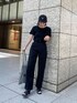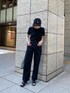 オールブラックの私服コーデ◎ 【pants】ルーズなシルエットが今年らしいハイウエストのパンツは、どんな体型の方にもオススメ♪ボーイズライクですが、ウエストはキュッと細身でスッキリとした腰回りデザインなので、楽ちんながらもシルエットは綺麗に履いていただけます!162センチでSサイズ着用ですが、ペタンコで合わせてもちょうど良い丈感です。真っ黒のデニムは一年中履けるので一本持っていて間違いなし♡私物のTシャツとキャップも黒で合わせたオールブラックコーデでスタイリング組みました! 【shoes】トング型のサンダルで、2つの素材が組み合わさっているMURUAらしいデザインがオシャレです♡ヒールは7.2センチなので高すぎず安定感もあるので長く履いていただけるかと思います。