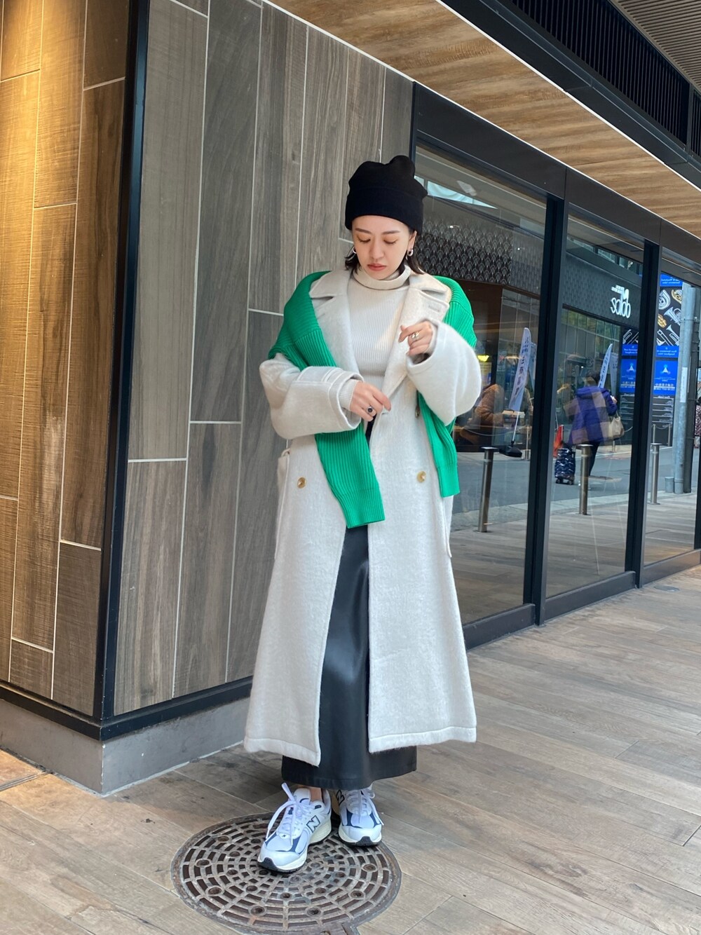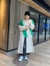 冬のオススメアウターコーデ☃︎ 【coat】毛足の長いシャギー素材のロングコート◎SとMで着丈が5センチ変わりますが、私はゆるっとオーバーサイズで着るのが好きなので162センチでMサイズ着用しております。中に厚手ニットも気込めるので真冬でも防寒バッチリです! 【knit】肩にかけているグリーンのニットは、リアルバイのバルキーコットンオーバーニット✌︎モノトーンコーデで少し物足りなかったので、マフラー代わりとして肩掛けしました♪コーデのポイントにもなるのでカラーニットは一枚持っていて間違いなしのアイテム◎