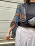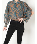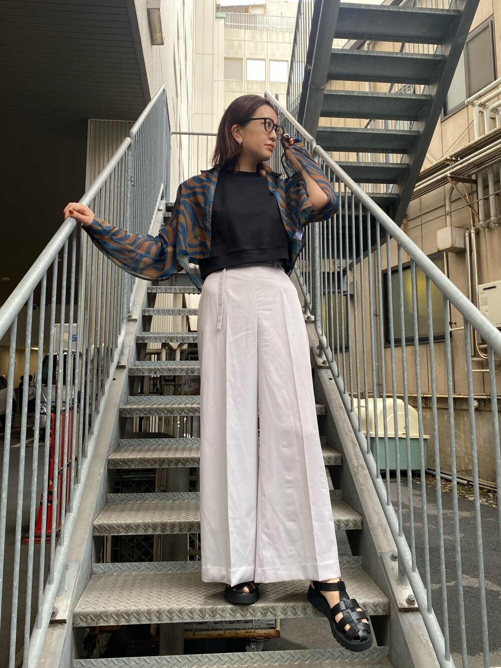 【shirt】ウェーブ柄が目を惹くショート丈のシアーシャツは他の人と被らないオシャレアイテム♡袖口が大きくスリットの入っているデザインなので、異なるイメージで着回しができちゃいます! 【pants】162センチでSサイズ着用ですが、割と丈が長めなので高身長の方にぜひ履いていただきたいです♡サラッとした生地感でこれからの時期夏におすすめ♪