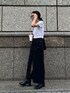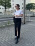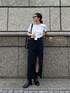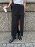 シンプルモノトーンコーデ 【skirt】 スリットが大きく入ってるデニムスカート私はブラック派♡162センチで、丈を長く履きたかったのでMサイズで着てます。柔らかい生地感なので動きやすさもあり、季節問わず長く着回せます! 【boots】 シンプルなブーツなので今から発売の夏服でも秋冬服でも合わせやすく、ヒールの高さも6.2センチと高すぎないのがポイント◎普段24センチの私ですが24.5センチでちょうどよかったです◎