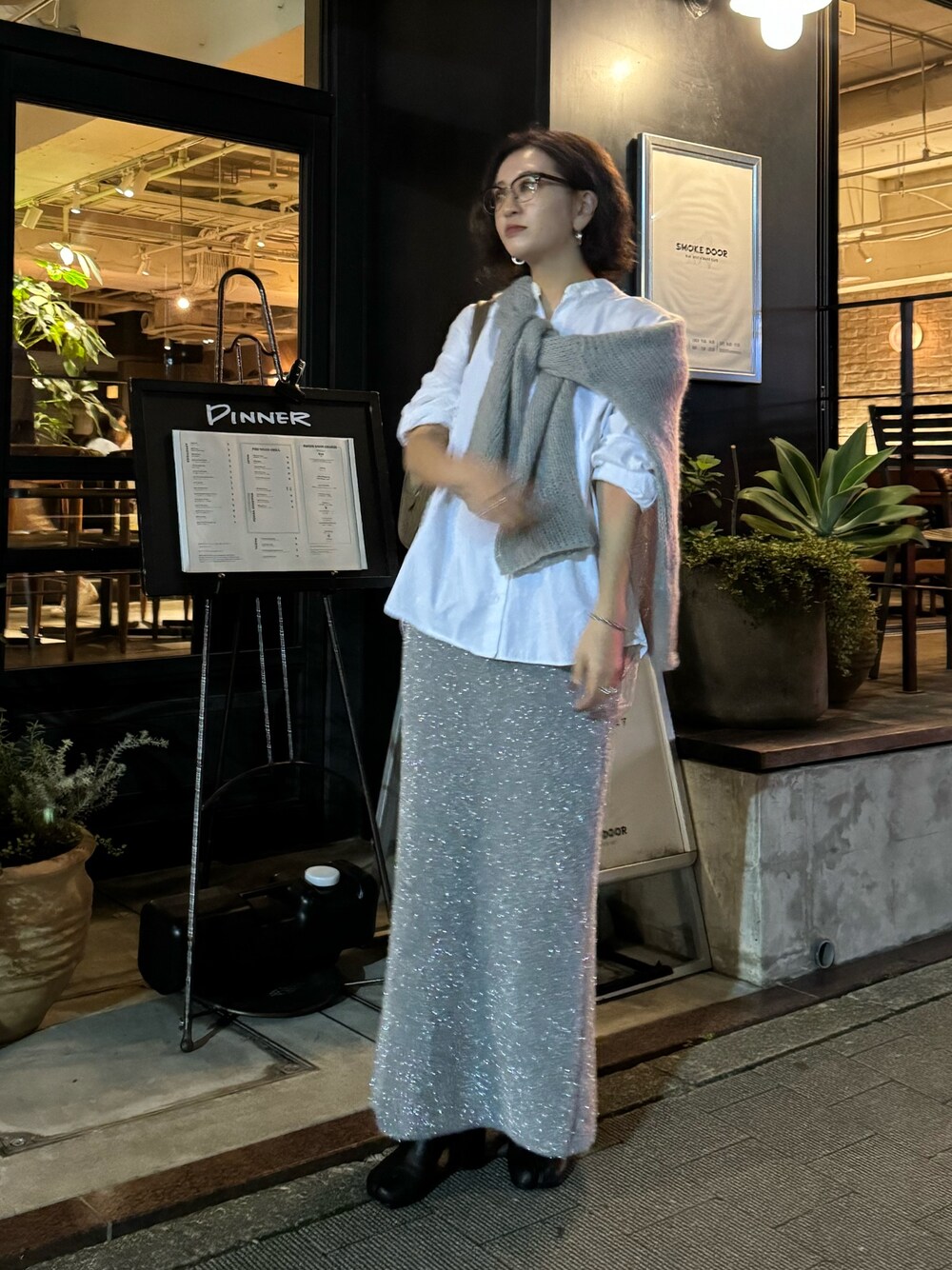 休日コーデ 【skirt】 今年トレンドのラメニットスカートを私服で履いてみました♡バックスリットが入ってるので歩きやすく、伸縮性があるので履き心地も抜群◎ゆったりとしたトップスと合わせて履くのがオススメです♡