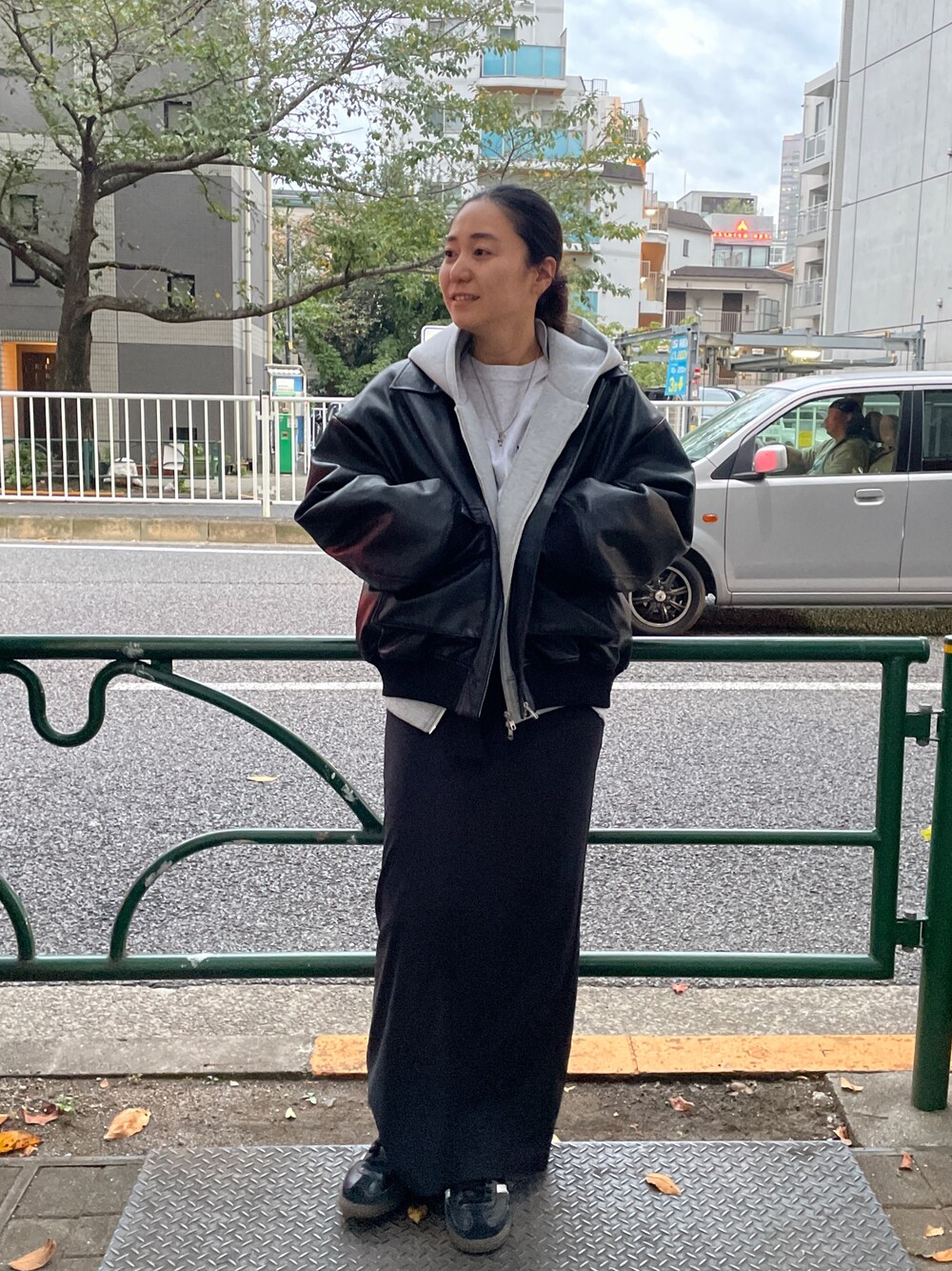 たっぷりサイズのレザージャケットは、中にパーカー着ても余裕です✌️ 間違いない組み合わせで、SETで欲しい✨ 合わせはスカートにして、女性らしさも足して🌷