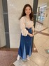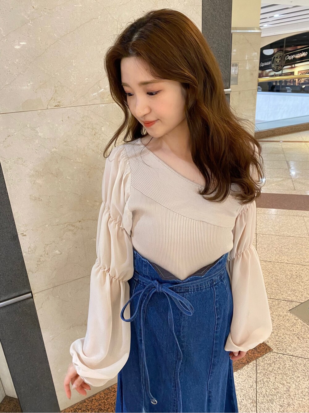 胸元がアシメネックになっているので丸顔の私でも顔がすっきり見える嬉しい効果が!! 程良い開き具合なので、インナーが見えてしまう心配もないです^_^ お袖をめくって頂ければ半袖風になるので長い期間着て頂けます♡ デニムスカートは150㎝の私でも、丈を気にせず着れました!!マーメイドシルエットのおかげで脚長効果も見せてくれます♡付属のリボンは片結びにしても大人可愛くなって素敵ですよ♪