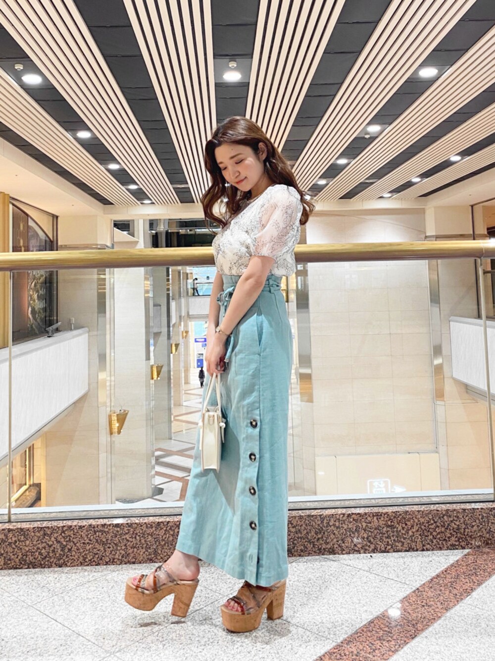 明るい綺麗なブルーのお色味が気になっていて、再入荷したのでこれを機に履いてみました♡ どうしても丈問題で悩む方がとても多いと思うのですが、こちらのスカートは150㎝でも、Sサイズは裾が床につかず履く事が出来ましたよ(^^)お写真ではヒールが高いサンダルで合わせていますが、ペタンコサンダルで合わせてみても床にすそがつかず履けました♡ 私はカジュアル過ぎずに着たいので、お袖がパフになっていて可愛いらしいレースのブラウスと合わせてカジュアルフェミニンにしてみました♪ もちろん、シンプルなTシャツなどとも相性が良いので夏に履いて頂いてもばっちりなスカートです!